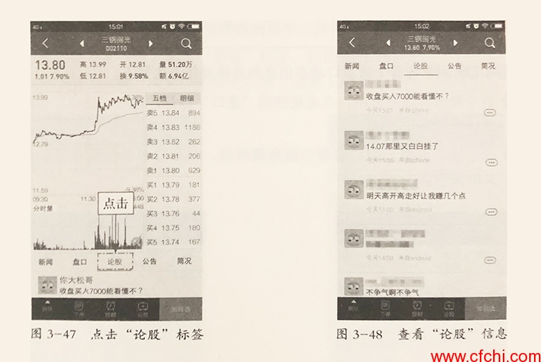步骤2:向上滑动屏幕,即可查看其他投资者对于个股的评价,如图3-48所示,点击右侧的点按钮C,可以与其他投资者进行互动。
