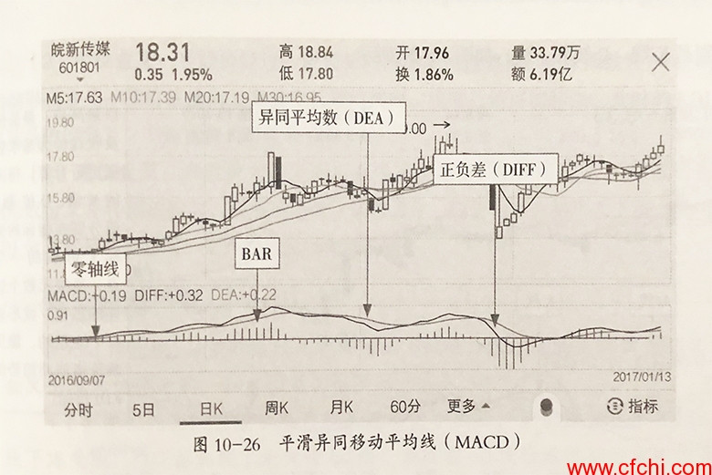 MACD是从双移动平均线得来的,由快的移动平均线减去慢的移动平均线计算而来。MACD比单纯分析双移动平均线的差阅读起来更为方便和快捷。图10-26所示为MACD指标在盘面中的表现形式。