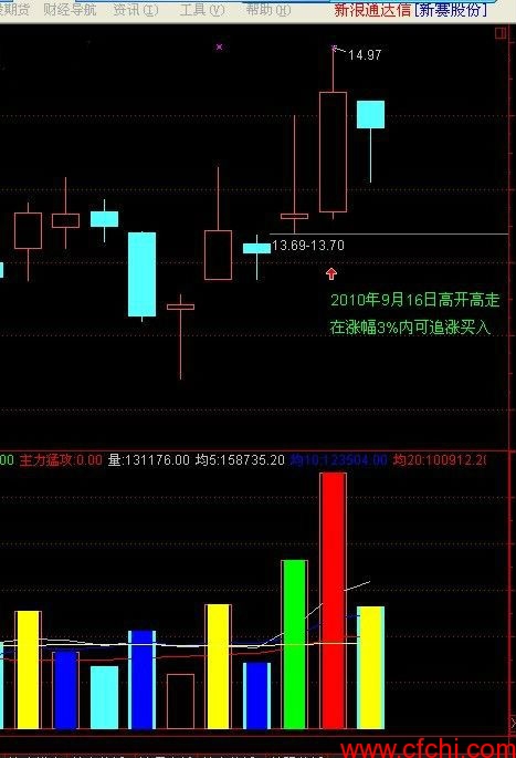7.满足以上条件后,第二天的走势非常重要,要求第二天的股价是高开高走,如低开则应快速向上拉升,买入时应配合非常规买点操作方法进行。