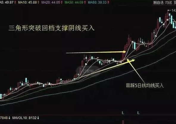 由于股市价格长期沿三角形走势调整,股价突破三角顶端伴随成交量放大,股市价格增加,这就不宜追高,可等待后期三角行顶部在阴线买入。