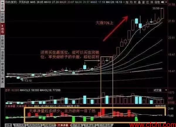 观察个股一段时间内大单净量走势变化,如一段时间内大单净量翻红天数增加,股价出现稳步抬升走势,可果断逢低介入。不是非要买在最低位才能赚钱!