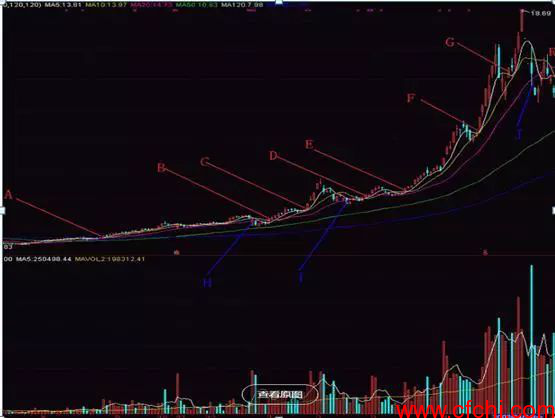 选择小阳小阴底部逐步攀升的股票,这里也要注意一个重点,最好不要是中阳以上的阳线或中阳,切记以小阳小阴为主。 核心:这些小阳小阴的K线最好是在均线之上,这种股票很容易拉出大阳线。