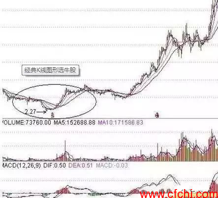 (2)选择沿45度角向上运行的股票,而成交量逐步递减的股票。因为沿45度角向上的股票走势最稳,升势最长,所以我把这样的股票称之为“慢牛股”。