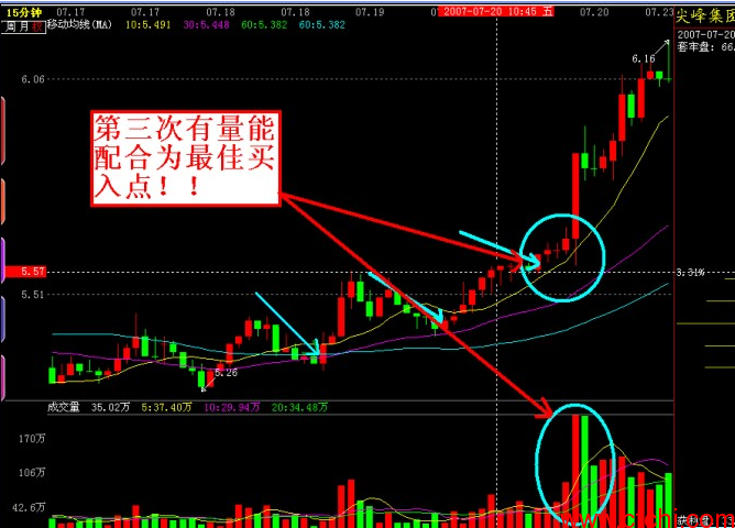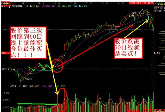 这个操作方法是您已经选择好股票后,再寻找买入点.把K线用F8切换到15分钟K线图,然后移动均线设置为10、30、60日均线。那么股价从空头排列上穿并站稳在60均线上方,等待10、30均线金叉,股价突破60日均线后。肯定有一部分投资者选择解套抛压获利了结,那么股价再次回落到60日均线上受到强支撑的话,说明主力不想再让股价下跌,就在这个价位再次突破时,下方的成交量明显突破前期量能时,说明主力开始拉升,在这价位就是我们最佳的买入点。有买入肯定存在卖出,这个波段的最漂亮的卖出也是非常准确的卖出点,就是股价只要跌破15分钟K线图上的60日均线,可以获利了结。这个操作方法大盘和个股都能使用。