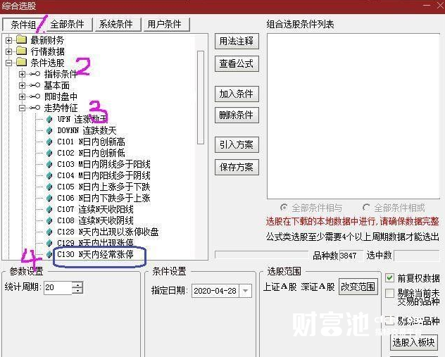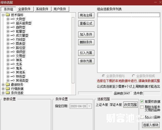 3.回到页面,选择公式 fx ,点击后选择综合选股,弹出“综合选股”的界面 ,如下: