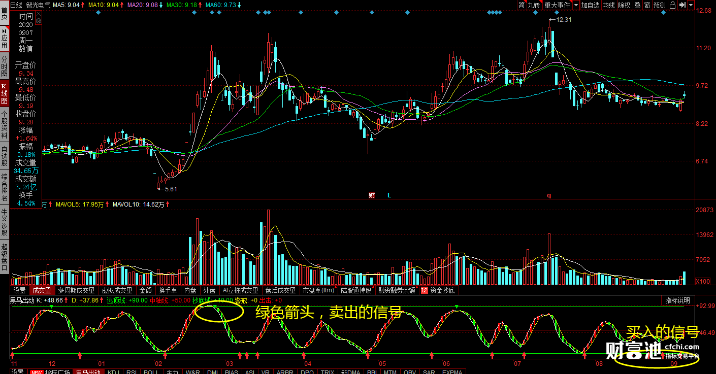 卖出点:当在“逃顶线”附近出现绿色的向下的箭头的时候,就代表是股价的搞点,这时候要注意及时卖出。