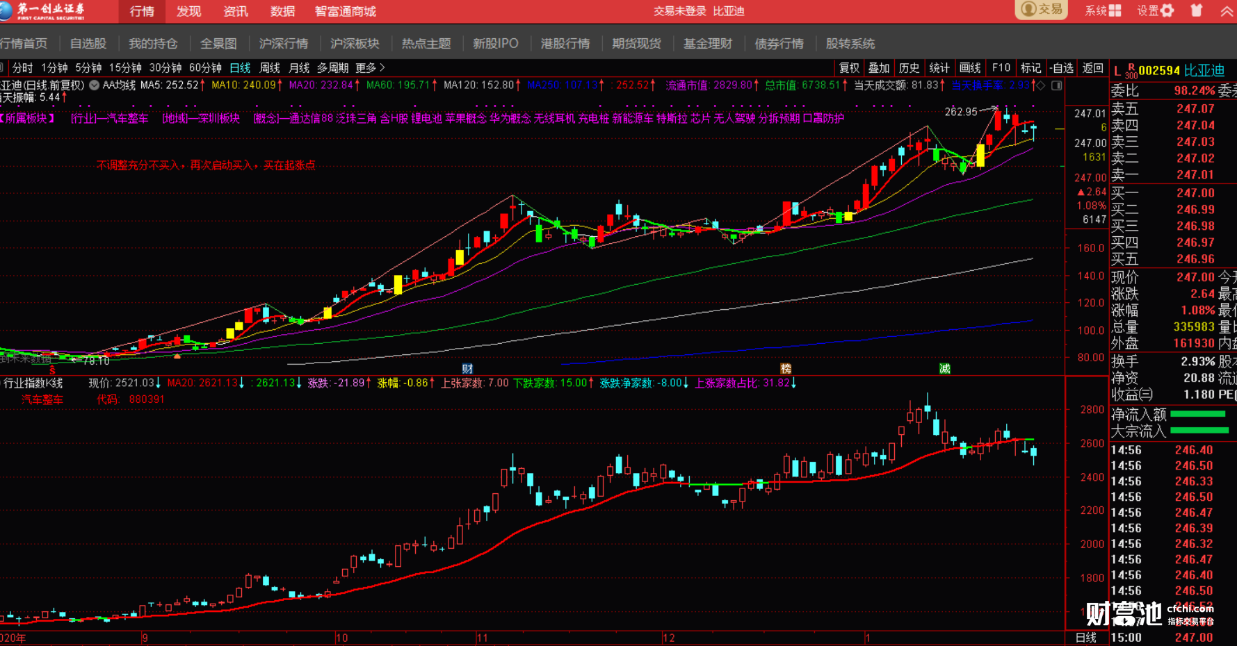 1、附图的k线是个股对应行业指数k线,比如上图是东方财富,附图显示的是证券块指数走势图,明显看到券商板块走势多是震荡,很少有趋势性的行情,那么板块内的个股走势也多是如此,难有好的收益。板块指数的走势代表了板块内绝大多数的股票的走势!另外一个是图是比亚迪,属于汽车板块,汽车板块指数明显处于上涨趋势中,2020年的汽车板块牛股辈出,比亚迪、长城汽车等都是牛气冲天,涨幅巨大。所以选股要选择板块指数处于上涨的,板块内个股才会有机会的!