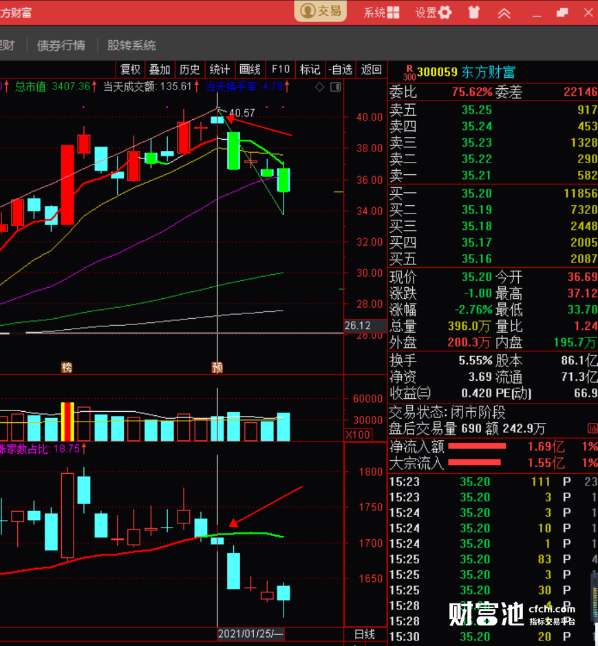 4、通过板块指数的走势还可以让你卖在高点,还以上图的东方财富为例,我们可以看到证券板块指数在2021年1月15日已经跌破红绿线且线已经显示绿色,说明证券板块整体已经走弱,这是值得警惕的信号,但是东方财富还是比较强势当天创了新高,当天卖出东方财富的话,正好出在了最高点。所以,如果行业指数k线破位的话,你手中的个股还强势,逢高减仓或者卖出是不错的选择,因为倾巢之下岂有完卵。如图所示: