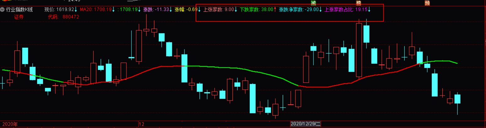 5、指标提供的还有板块内上涨家数,下跌家数,净涨跌家数,上涨家数占比等数据辅助分析,让你更好的把握板块,把握个股的情况。如图