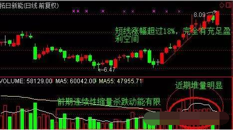 何为堆量:该股前期出现连续性的缩量之后(缩量表明洗筹充分,量能持续萎缩代表短线跌无可跌洗筹充分),突然某段期间开始放堆量拉升(开始启动),价格缓慢拉升,但是涨幅并不是太高,该股对应下方成交量像堆积的小山一样小山堆!这种形态称作“成交量堆量”。堆量的出现表明该股有主力开始关注了!(注意,前期连续性缩量后出现堆量中的前期出现过连续性缩星这一点很重要,若前期并未出现连续性缩量,只是近期量能放的比前期大,这样的堆量要大打折扣)这就是堆量形态牛股选取法的精髓。