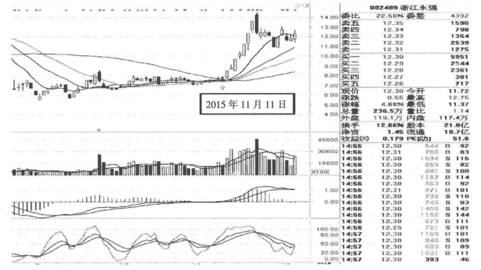 如2015年11月11日,在大盘反弹了一个月之后,浙江永强(002489)启动。