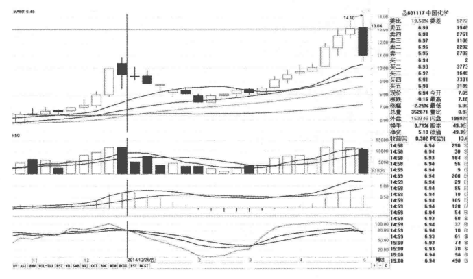 从中国化学(601117)自2014~2015年的周线图我们看到,虽然启动晚,但是涨势迅勐,波段清晰,49亿元的大盘股一点不比小盘股差。
