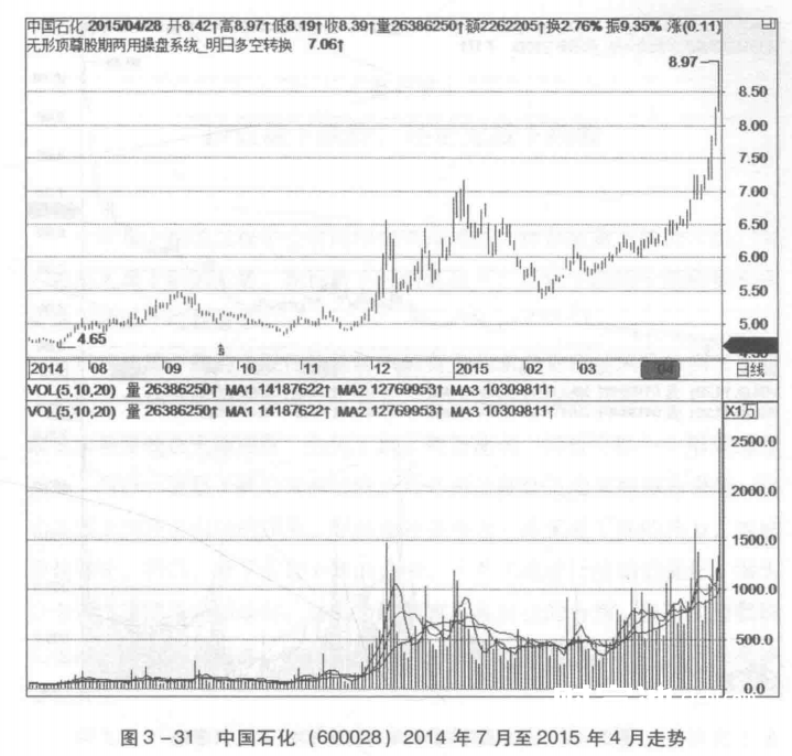 在图3-31中,中国石化是一只大盘蓝筹股,自2014年7月开始发动的上涨行情中,中国石化也形成了整体上升的形态,自低点到2015年4月份的高点股价上涨了4.32元,涨幅为92.9%。你可不要认为9个月的时间居然涨了这么多,同一时期指数都已翻倍,而它却还没有翻倍,涨幅是落后于指数的。