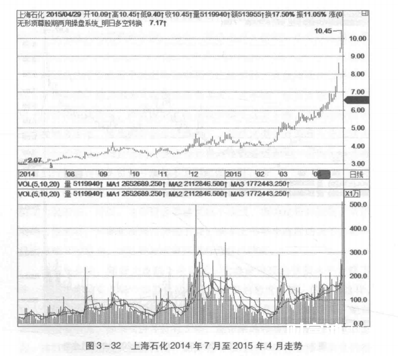 相比其他个股,上海石化肯定是大盘股,但对于中国石化来说,它只能排位于二线蓝筹。在图3-32中,自2014年7月上海石化的股价从2.97元上涨到最高的10.45元,上涨7.48元,涨幅为252%,其涨幅远远超过中国石化。为什么同属于石化板块,但是涨幅却相差这么大呢?