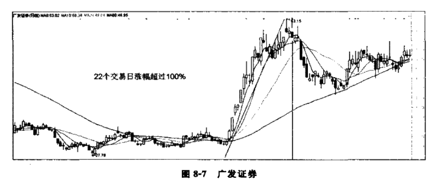 2010年涨幅最大的A股是广发证券(000776),以高达419.08%的年度涨幅拔得头筹。广发证券于2010年2月12日成功借壳S延边路在深交所上市,上市后股本25.1亿元,而流通盘只有9207万,大股本小流通盘的特点使得广发证券成为券商股的龙头,涨幅超过其他券商股。相关股价走势见下图(见图8-7)。