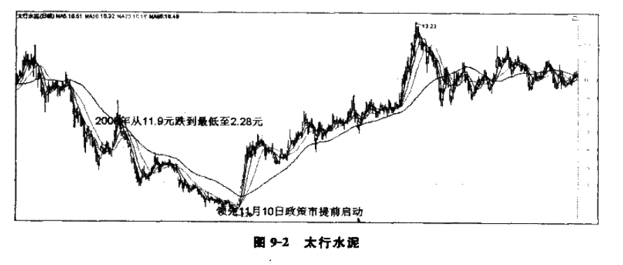 案例1太行水泥:最先启动的4万亿经济刺激计划受益股太行水泥(600553)超跌反弹的股价走势〔见图9-2)。