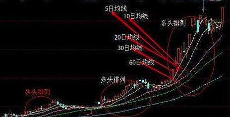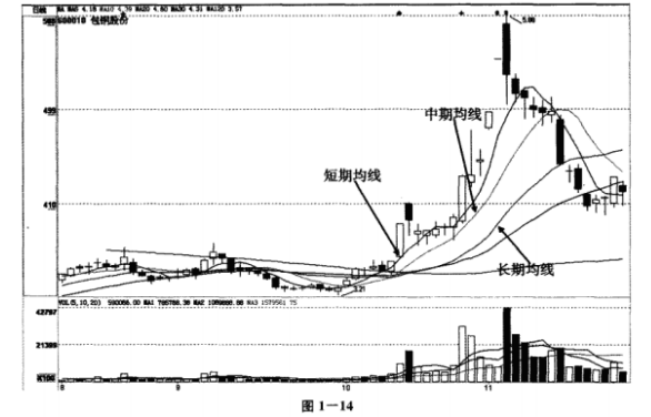 如图1-14所示,此图形名为多头排列,是一个短期、中期和长期均线排列的组合,这种图形一般多出现在涨势中,最上面的一根是短期均线,中间一根是中期均线,最下面的一根长期均线,这三根均线呈向上的弧状。