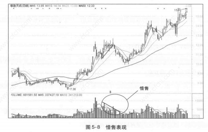(1)股价越往上涨,成交反而比前期减少;随着股价上涨,愿意抛售的人反而减少,反映出市场强烈的惜售心理(图5-8)。