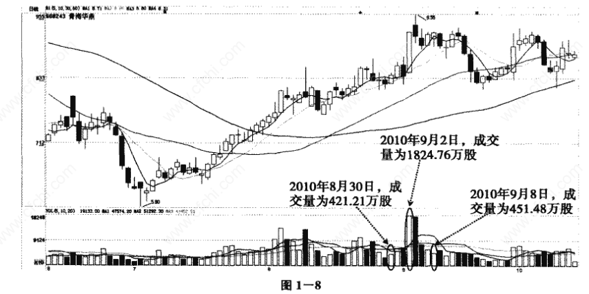 如图1一8所示,青海华鼎(600243)2010年8月30日的成交量为421.21万股,9月2日的成交量为1824.76万股,在9月8日的时候,成交量又降到451.48万股,成交量极不规则,忽高忽低。