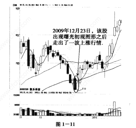 如图1—11所示,凯乐科技(600260)在2009年 12月23日出现曙光初现图形之后,股价走出了一波上涨的行情。