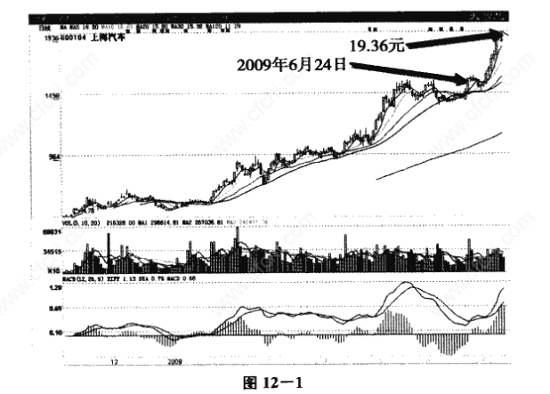 图12-1中,上海汽车(600104)在2009年6月24日以15.60元涨停,并在收盘前打开涨停板,为投资者提供了购入机会。此后股价一路上扬,虽有震荡但总趋势向好,一直涨到7月13日的19.36元,上涨幅度达到24%。