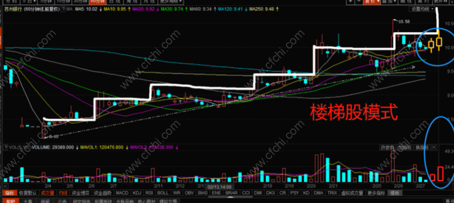 日K线沿45度角向上运行的股票,后续走势最稳健,趋势持续的时间最长。这就好比楼梯的角度建成45度时最稳定,我们称具备这样特征的股票为“楼梯股”。