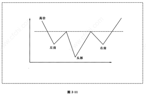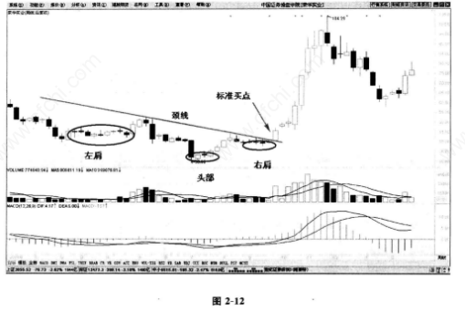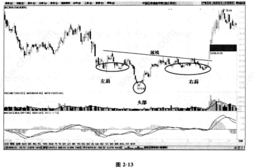 A.图2-12是荣华实业(600311) 在2010年1月到2011年2月之间的周K线走势图。在图中,我们可以看到该图形成了一个头肩底形态。B.仔细观察可以发现,头部形态后,成交量开始增长,意味着有专业的投资者在积极买进。C.股价突破颈线时,大阳线极为有力,同时成交量也显著增大,十分给力的形态,在大声疾唿买进。
