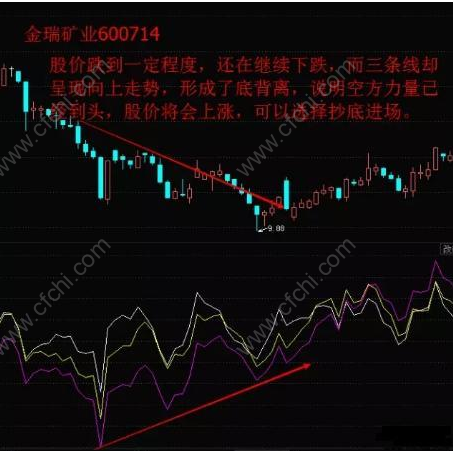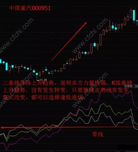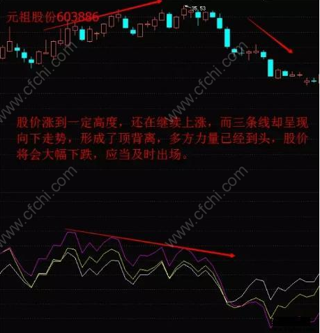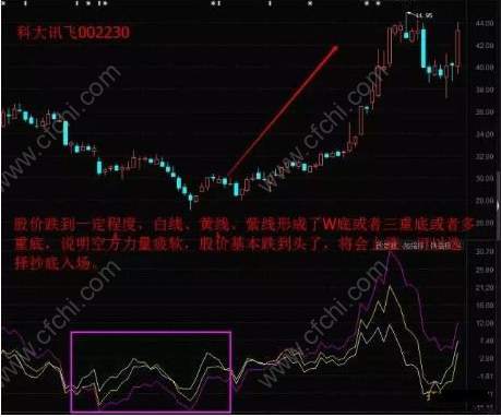1、三条线保持下降趋势,说明空方力量较强,K线维持下降趋势,没有发生转变,只要紫线走势没有发生重大改变,见到阳线都不要轻易进场。