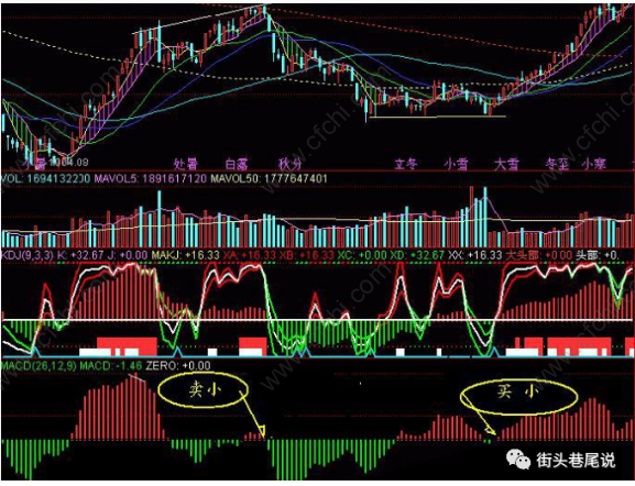 当一波气势汹汹的下跌,或一波气势如虹的上涨开始时,我们首先应避其锐气,保持观望。也就是说,当经历一波下跌后,当股票处于最低价时,此时MACD上显现的是一波“大绿柱”。我们首先不应考虑进场,而应等其第一波反弹过后(出现红柱),第二次再探底时,在MACD中出现了“小绿柱”(绿柱明显比前面的大绿柱要小),且当小绿柱走平或收缩时,这时就意味着下跌力度衰竭,此时为最佳买点,这就是所谓的买小(即买在小绿柱上)。