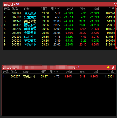 2、盘口5分钟涨速排行在前十名的个股,量峰出现萎缩性结构,如股价处于均线上升通道中,这是典型洗盘特征,属于备选对象,放在自选股2里。