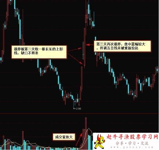 第一个交易日涨停板(或涨幅在5%以上的大阳),第二个交易日先上后下,收长上影(7%以上)十字线(阴阳均可),成交量放大,通常第三交易日会用长阳吃掉第二个交易日上影线。这根长上影线,通常就称之为“攻击迫线”。