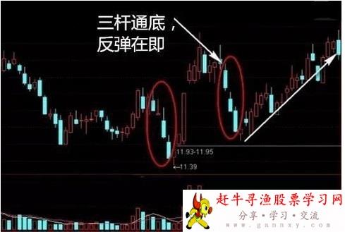 股价在经过阶段性调整已经有了较大的跌幅,此时接连出现三根大阴线,且一根接一根的下探股价低点的走势,就称为“三杆通底”。当此形态出现之后,股价往往会酝酿一波向上行情,因此,这是难得的短线获利机会。