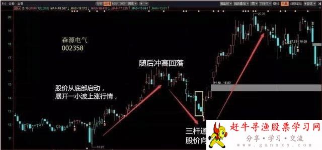森源电气从底部启动,展开了一小波上涨行情,之后股价冲高回落,三杆通底出现预示着主力洗盘结束,指数展开反弹行情。