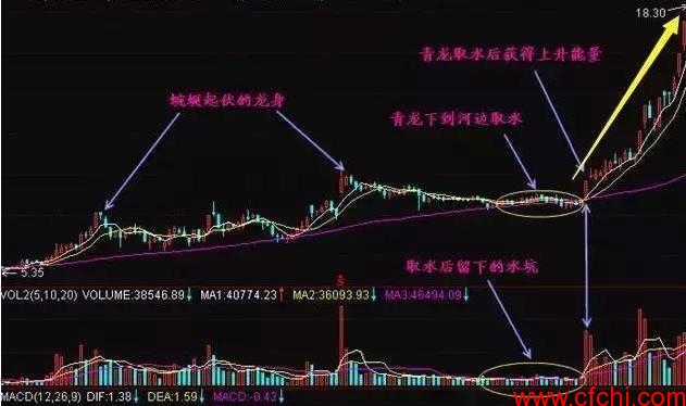 在5日、10日和60日均线图上,5日均线和10日均线不断地上下起伏,形如龙体。日K线图依附在龙体上如片片龙鳞。如此形成的青龙逶迤在60日均线之上,时间可达半年之久。青龙取水后得到上升的能量,于是腾空向上,股价大涨。