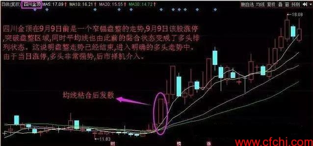 均线黏合是一种蓄势状态,意味着即将面临变盘。这里要注意均线黏合未必是向上发散,也可能是向下发散,因此需要等待股价拉起,平均线开始向上发散才可以参与。