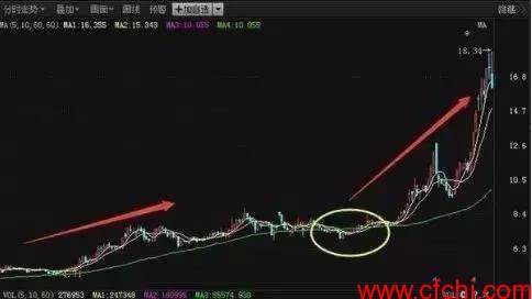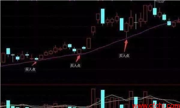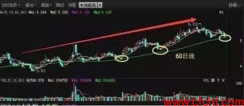 个股在长期下跌后,股价第一次站上60均线,急进的投资者可以跟进,稳健的投资者可以等到股价洗盘回调到60均线附近区域得到支撑买入,极其准确。注意此时的60均线的形态一定要翘头向上或持平。