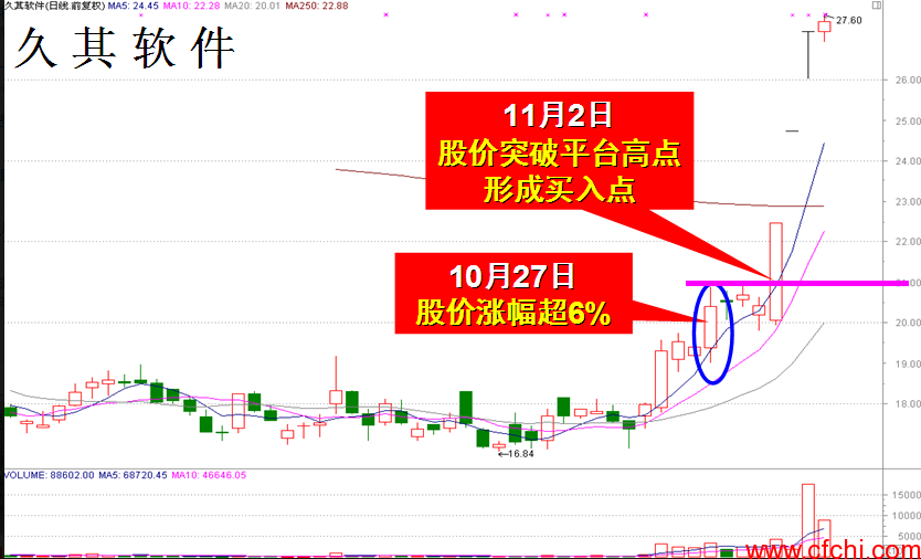 2、 股价刚刚突破前期平台高点。