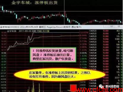 主力发力把股价拉到涨停板上,然后在涨停价上封几十万的买单,由于买单封得不大,于是全国各地的短线跟风盘蜂踊而来,你一千股,我一千股,会有一两百的跟风盘,然后主力就把自己的买单逐步撤单,然后在涨停板上偷偷的出货。当下面买盘渐少时,主力又封上几十万的买单,再次吸引最后的一批跟风盘追涨,然后又撤单,再次派发。因此放巨量涨停,十之八九是出货。