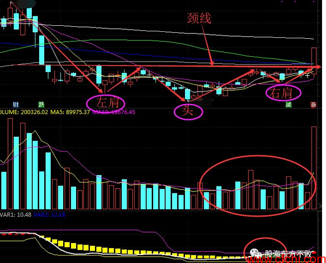 4、下图的案例看出,头部到右肩的形成过程中,阳线增多,阴线较少,阳线放量,量价关系转良。