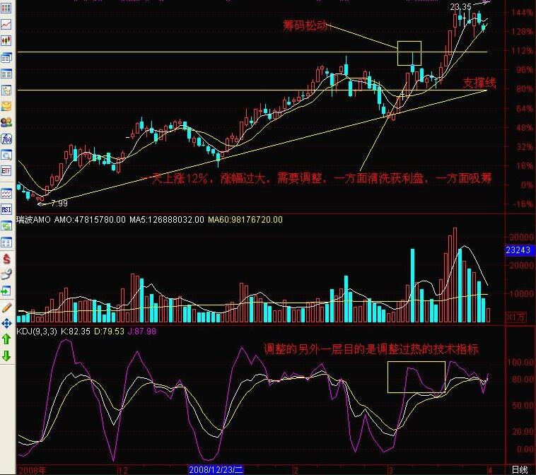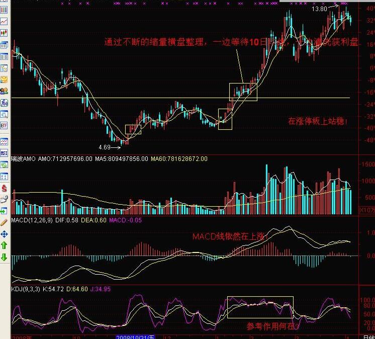 三、涨停板后的回档,多方拉升过于迅猛,或者再调整过热的技术指标;这里需要注意两点,其一,如果涨停之后出现相对高位的放量阴线,或许应该等待几天,就会在5日、10日线附近止跌,如果这个时候仅仅依靠过分放阴量得出股价到顶的结论,或许就有些不对了,必须等等;其二,如果碰到缩量的涨停板后调整,就是庄家在送红包了;