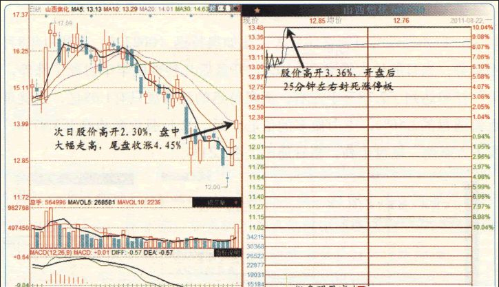 示例:比如山西焦化(600740)在2011年8月22日当日开盘后25分钟左右封死涨停,之后出现了多笔千手的卖单,成交活跃。好股票网打板专注短线技术技巧进阶。2、3分钟之后抛盘明显减小,盘中也没有出现连续的大单,最大的一笔出现在10:05,成交了3468手。直到收盘时,抛盘都没有出现异常放大。当日换手率6.29%,这就是一个“好板”。次日股价顺势髙开2.30%,盘中大幅走髙,最大涨幅7.79%,最终收盘涨幅4.45%。