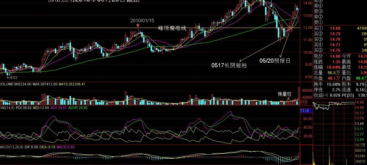 4.0513的阳线,覆盖了0512的阴线,形成了阳包阴的K线组合,说明该股已有企稳迹象。同时,“0513的量柱为黄金柱,0514为中继(即我常说的接力)黄金柱,今天(0520)得到再次确认”(作者注:引号内的内容为预报日所写的原话,下同)。