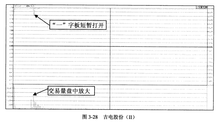 (2)分时图形态分析。如图3-28所示,吉电股份开盘便涨停,盘中出现短暂的回落后又迅速上封涨停板。可见,该股在开盘涨停的情况下,买盘其实已经非常强大。