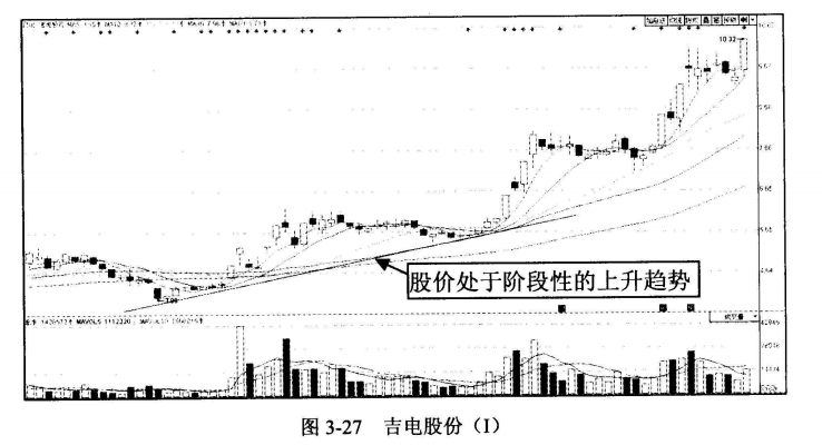 (1)日K线的位置分析。如图3-27所示,吉电股份股价处在阶段性的上涨过程中。在这种走势中,每一阶段的拉升过程,股价都比较容易出现较大的涨幅,甚至会出现涨停板。投资者在这种走势中,应多注意K线的组合形态。在适当的时候介入追涨,进行波段操作,可以在短期内获得不错的收益。