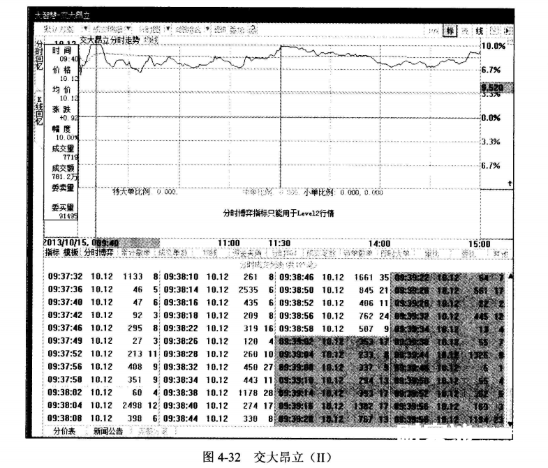 图4-32是当日K线的分时图。我们截取了涨停当时的逐笔交易记录。从图中我们看到在股价封在涨停板时,分时出现的买单多是大笔数额的。主力资金出货明显。随后的涨停更只是以涨停价出货。此时挂单买入的买盘或没有及时离场的散户损失惨重。