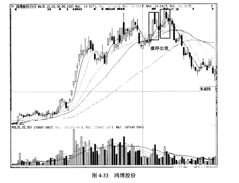 图4-33是鸿博股份在2014年5月~2014年11月的K线走势图。图中出现两个连续的涨停出货。主力资金利用少量的资金拉升股价,做出股价将再创新高的姿态,吸引买盘跟风,达到高位出货的目的。