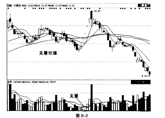 图8-2为一个无量涨停形态。股价经过一段时间的下降后,某天走出一个涨停,但是当日的成交量并没有急剧放大,换手率也很低,随后股价出现一路飞涨,这就属于一个典型的无量涨停板。