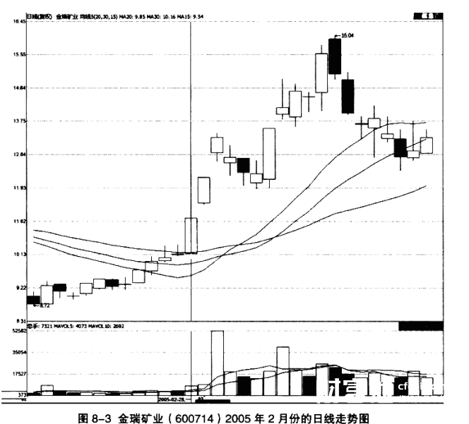 图8-3为金瑞矿业( 600714 ) 2005年2月的日线走势图,当时市场依然十分低迷,股指呈现反复探底,2005年2月28日出现涨停板,但成交量并没有急速放大,当日换手率只有1.82%,远远小于5%,属于典型的无量涨停板,奠定后市持续上涨基础,该股随后果然出现连续大涨。