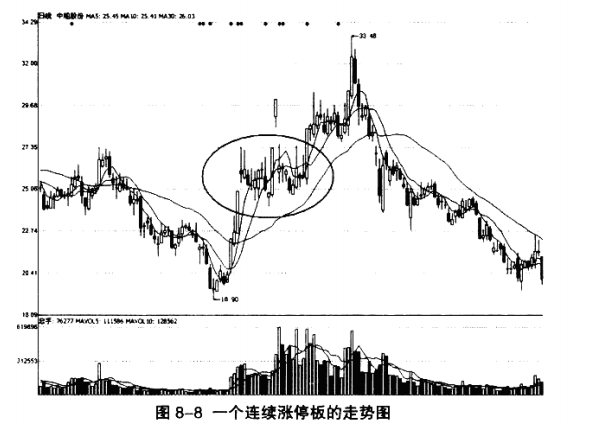 图8-8为一个连续涨停板的走势图。对持续涨停板的股票,最佳的买入机会是在其连续两个涨停成交量极少的情况下,若第三个涨停板被打破并且当天成交量放得极大,可在其尾市介人、这时才会有较佳的短线机会,不可在上午或者下午开盘后介入。