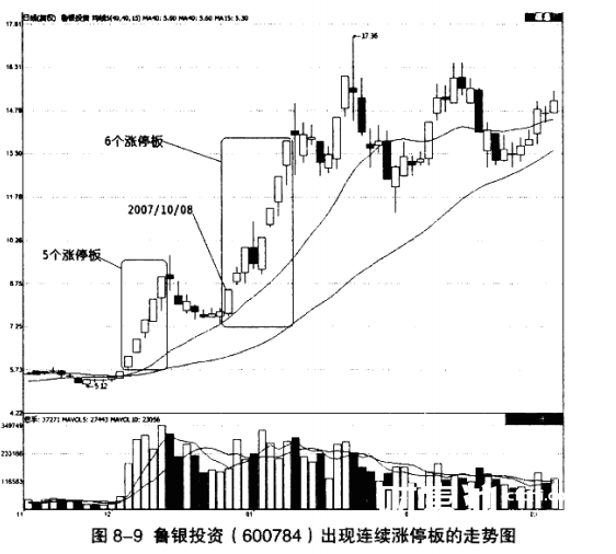 图8-9为鲁银投资(600784 )出现连续涨停板的走势图。该股2006年6月和2006年10月形成大型双头部、2006年12月8日开始以涨停的方式突破大型双头部、主力手法凶悍,连续拉出三个涨停板,公告复盘之后继续出现两个涨停板,完美体现"有三必有五”。根据“有五必有七”,连续的五个涨停板,让我们对它又有了更高的期望。